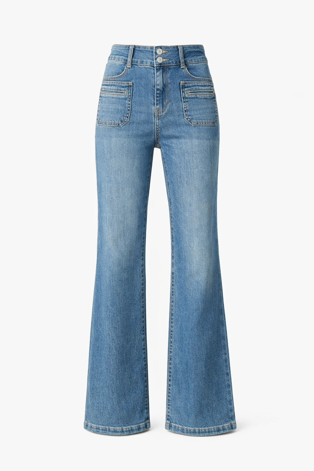 High-waisted stretch denim jeans designed to highlight the waist and flatter your curves. Featuring a stylish dual-button front design, front pockets, and a wide-leg flared bootcut silhouette. Made from a soft, stretchy cotton blend for comfort and flexibility, offering tummy control support for a smooth, confidence-boosting fit. Perfect for casual wear or office styling all year round.