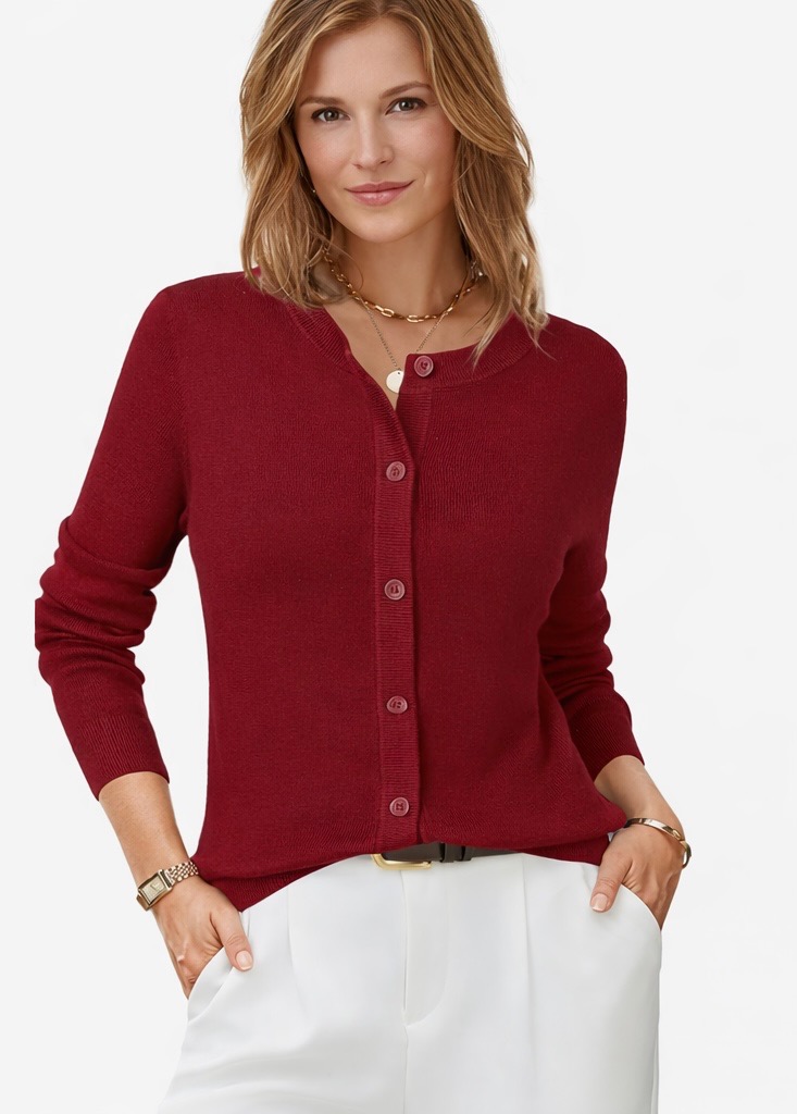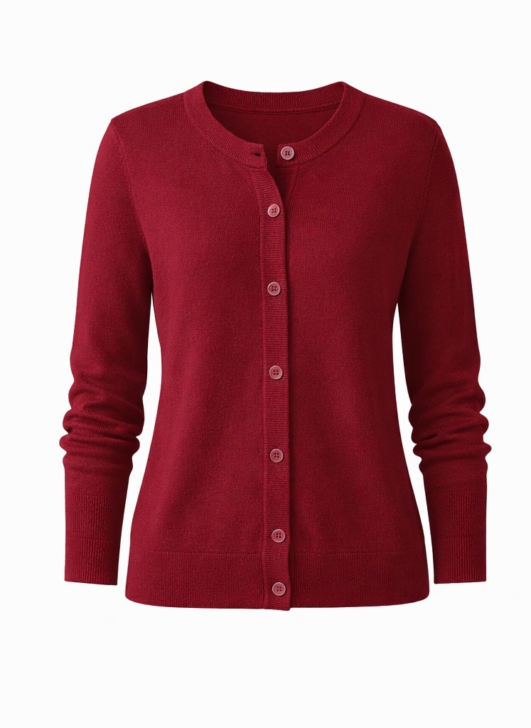 A lightweight wool-blend cardigan designed for a polished and versatile look. Featuring a classic crew neckline, button-down front, and ribbed trims, this soft and stretchy knit offers comfort without bulk. Its refined silhouette makes it ideal for layering in both professional and casual settings, pairing effortlessly with jeans, skirts, dresses, or tailored pants across all seasons.