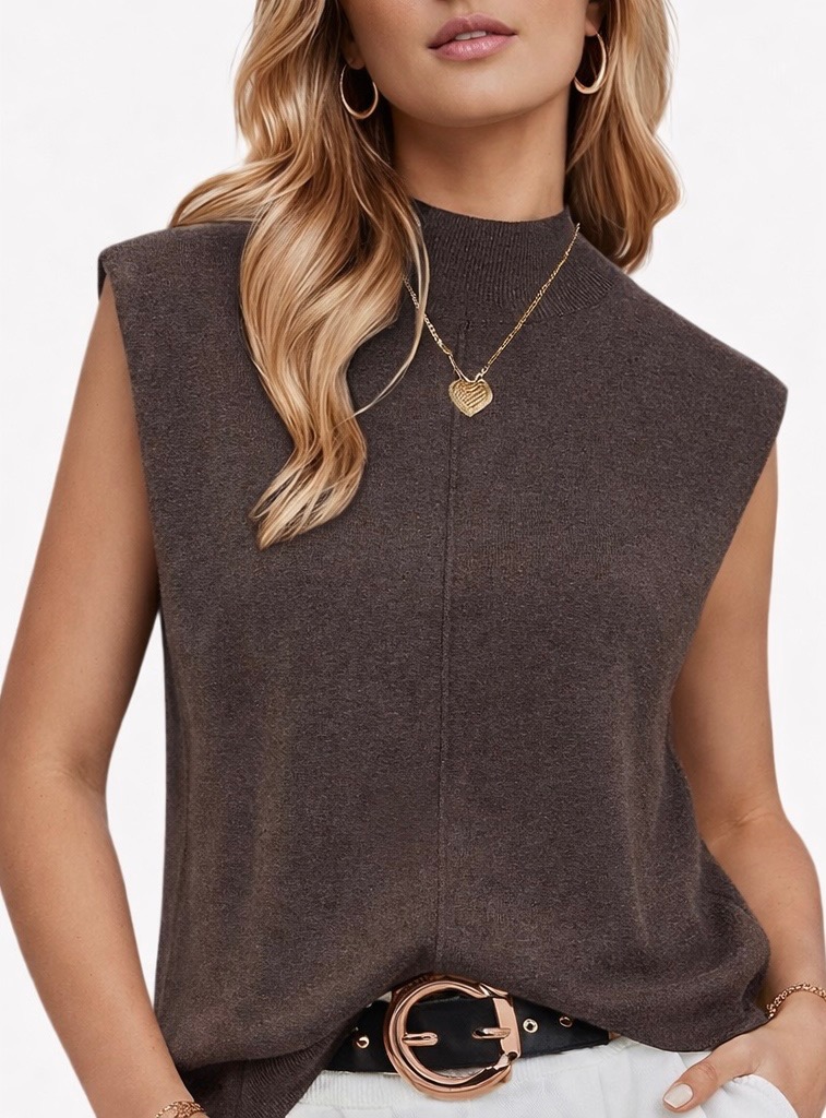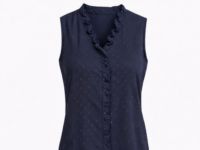 A polished sleeveless blouse featuring elegant ruffle detailing and a tie-neck design for a sophisticated touch. Made from a soft and stretchy polyester-spandex blend, this versatile blouse transitions easily from office wear to casual outings. Its lightweight feel and timeless silhouette make it a wardrobe essential that pairs beautifully with jeans, skirts, or tailored trousers.