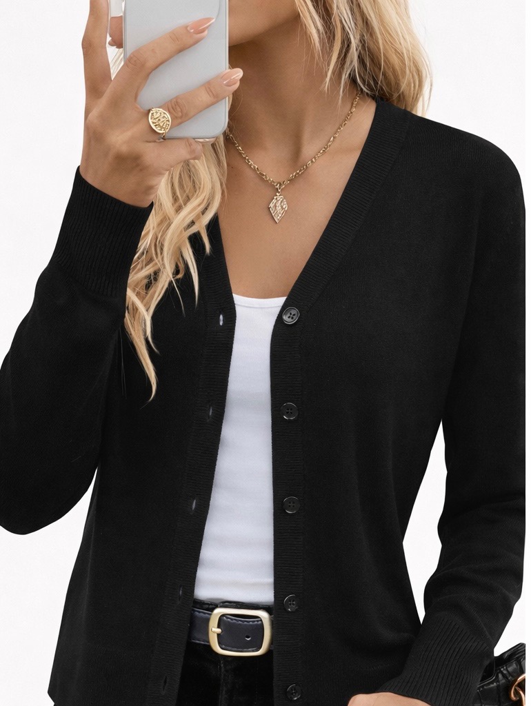 A timeless wool-blend cardigan designed for effortless elegance and everyday comfort. Featuring a classic V-neckline, button-down front, and a soft, stretchy knit, this piece delivers a refined yet cozy feel. The anti-pilling fabric and breathable blend make it ideal for layering across seasons. Perfect for business casual outfits, travel, or daily wear, it pairs beautifully with shirts, dresses, jeans, or tailored pants.