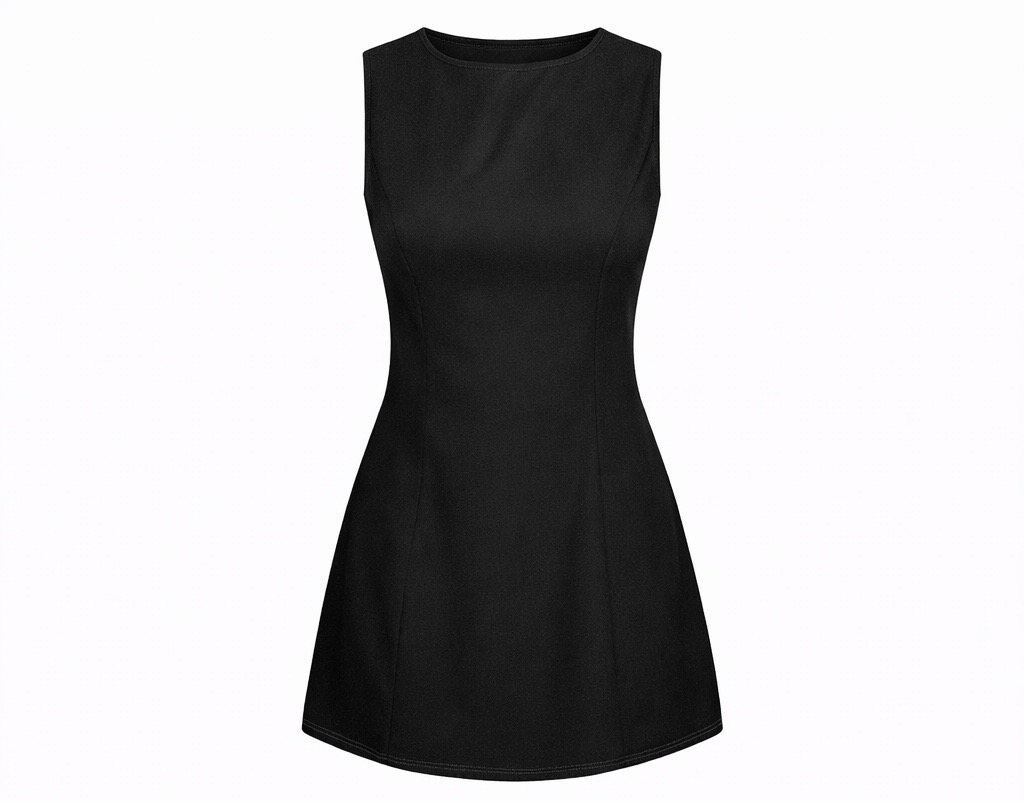 An elegant sleeveless A-line mini dress designed with a classic boat neckline that beautifully frames the collarbone. Made from soft and lightweight fabric, this dress offers a flattering high-waist silhouette and comfortable fit. Perfect for summer events, cocktail parties, work occasions, or evening outings when styled with heels and statement accessories.