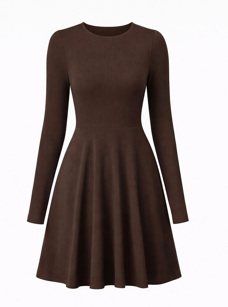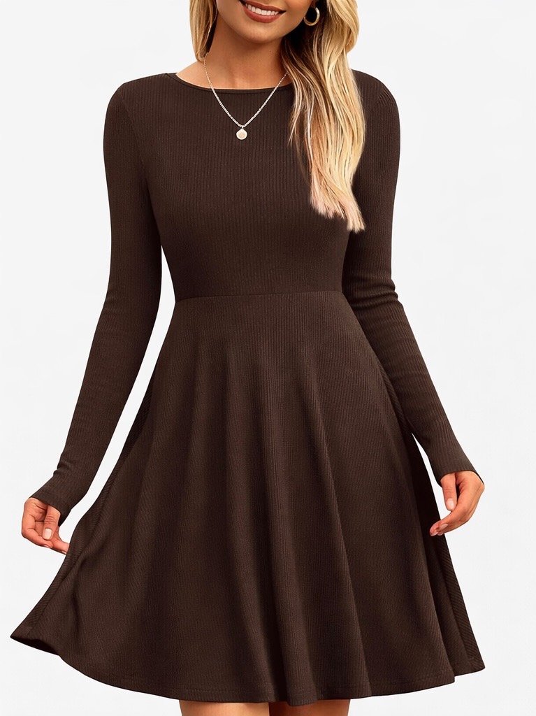 A comfortable and elegant ribbed knit dress designed with a classic crew neckline and flattering A-line silhouette. Made from soft stretch fabric, this long sleeve dress provides a cozy yet stylish look for cooler seasons. Featuring an elastic waist and flowy hem, it pairs easily with boots or jackets for casual outings, office wear, or fall gatherings.