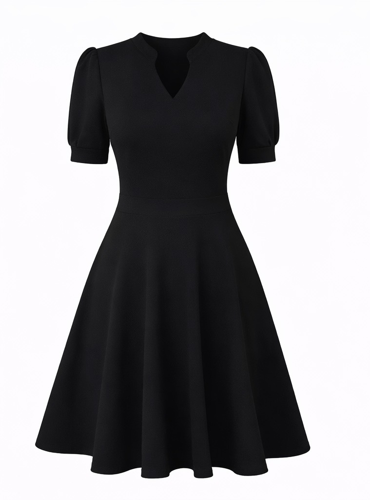 A stylish knee-length dress designed with a flattering V-neckline and elegant puff sleeves. Featuring a fitted waist and flowing A-line skirt, this dress creates a feminine and polished silhouette. With practical side pockets and a hidden back zipper, it is perfect for office wear, weddings, brunches, or semi-formal events.