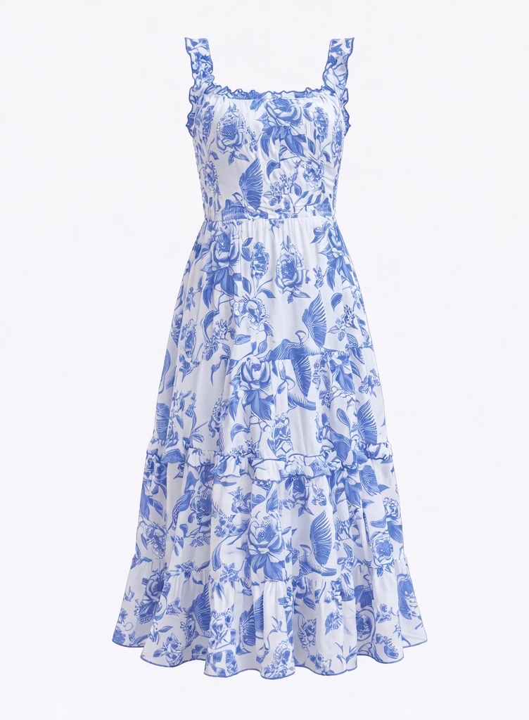 A romantic floral summer dress inspired by vintage Renaissance style. Featuring a square neckline, smocked bodice, and flowing tiered skirt with delicate lace trim, this elegant dress creates a flattering A-line silhouette. Lightweight and comfortable, it’s perfect for garden parties, vacations, casual summer outings, or special occasions.