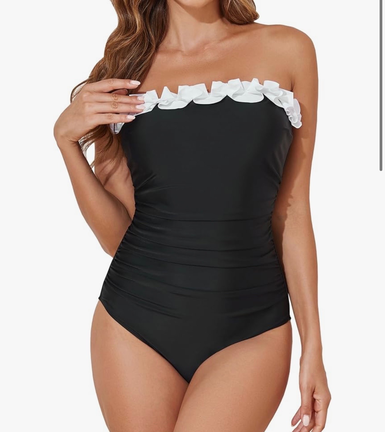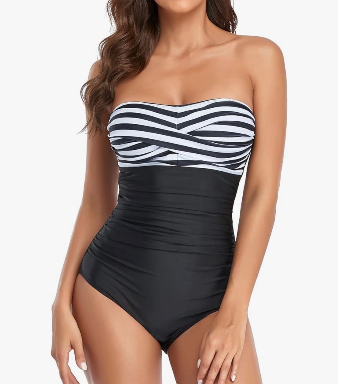 A flattering one-piece swimsuit designed with a strapless bandeau neckline and ruched detailing for a slimming silhouette. Featuring tummy control and soft stretch fabric, this swimwear enhances your shape while providing comfort and support. With removable straps for versatile styling, it’s perfect for beach days, vacations, and poolside lounging.