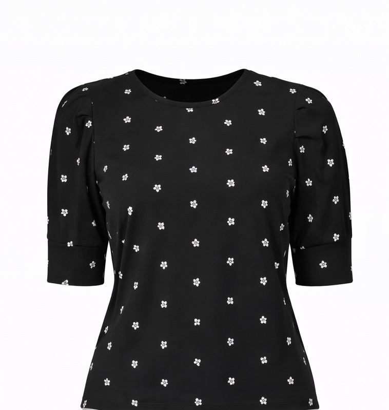 A stylish knit blouse featuring a delicate floral print, elegant puff sleeves, and a unique knot neckline that adds texture and sophistication. Designed with tailored seams for a flattering fit, this versatile top pairs easily with jeans, skirts, or dress pants, making it perfect for office wear, casual outings, or evening looks.