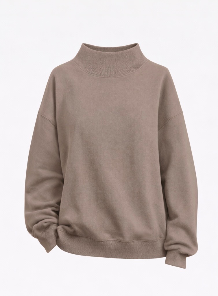 A cozy oversized sweatshirt designed with a relaxed fit and stylish turtleneck collar. Made from a soft cotton-polyester blend with a warm fleece lining, this pullover provides comfort and warmth for cooler seasons. Featuring drop shoulders and a casual silhouette, it pairs easily with jeans, joggers, or leggings for everyday fall and winter outfits.