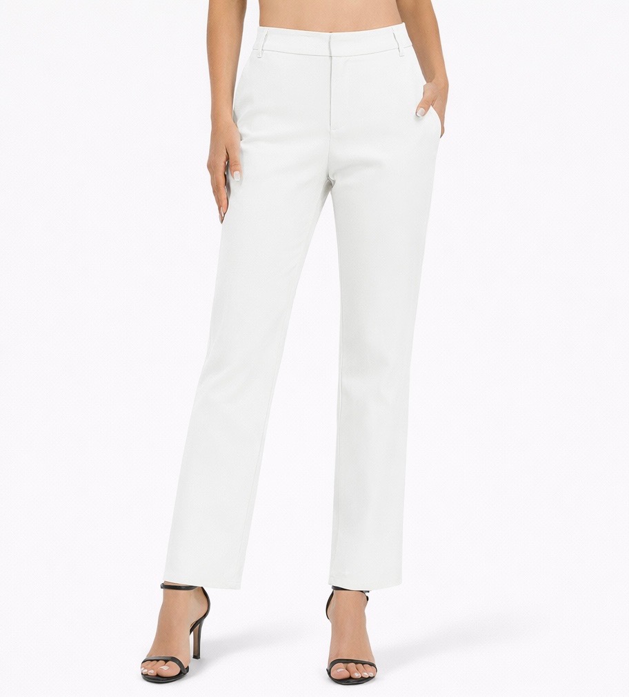 Comfortable pull-on mid-rise trouser with elastic waistband and straight-leg fit. Made from soft stretch fabric with four functional pockets. Versatile style suitable for work, casual outings, or everyday wear.