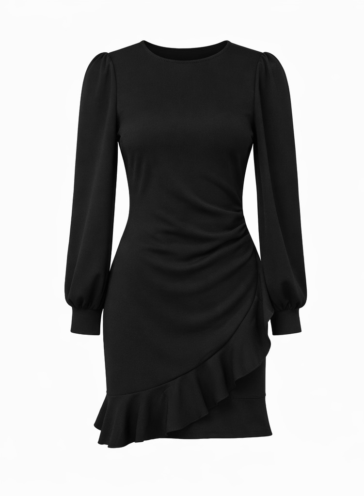 A chic bodycon mini dress designed with elegant puff sleeves and a playful ruffle hem for a stylish and feminine look. Made from lightweight polyester with a flattering ruched silhouette, this dress offers a comfortable body-hugging fit. Perfect for cocktail parties, date nights, weddings, and festive occasions when paired with heels and statement accessories.